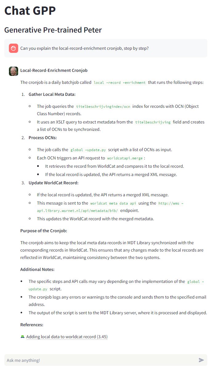 We named the tool ChatGPPeter in honour of our retiring colleague, Peter van Boheemen. He significantly contributed to developing Library products and services used not only in our library but also in other libraries across the Netherlands.